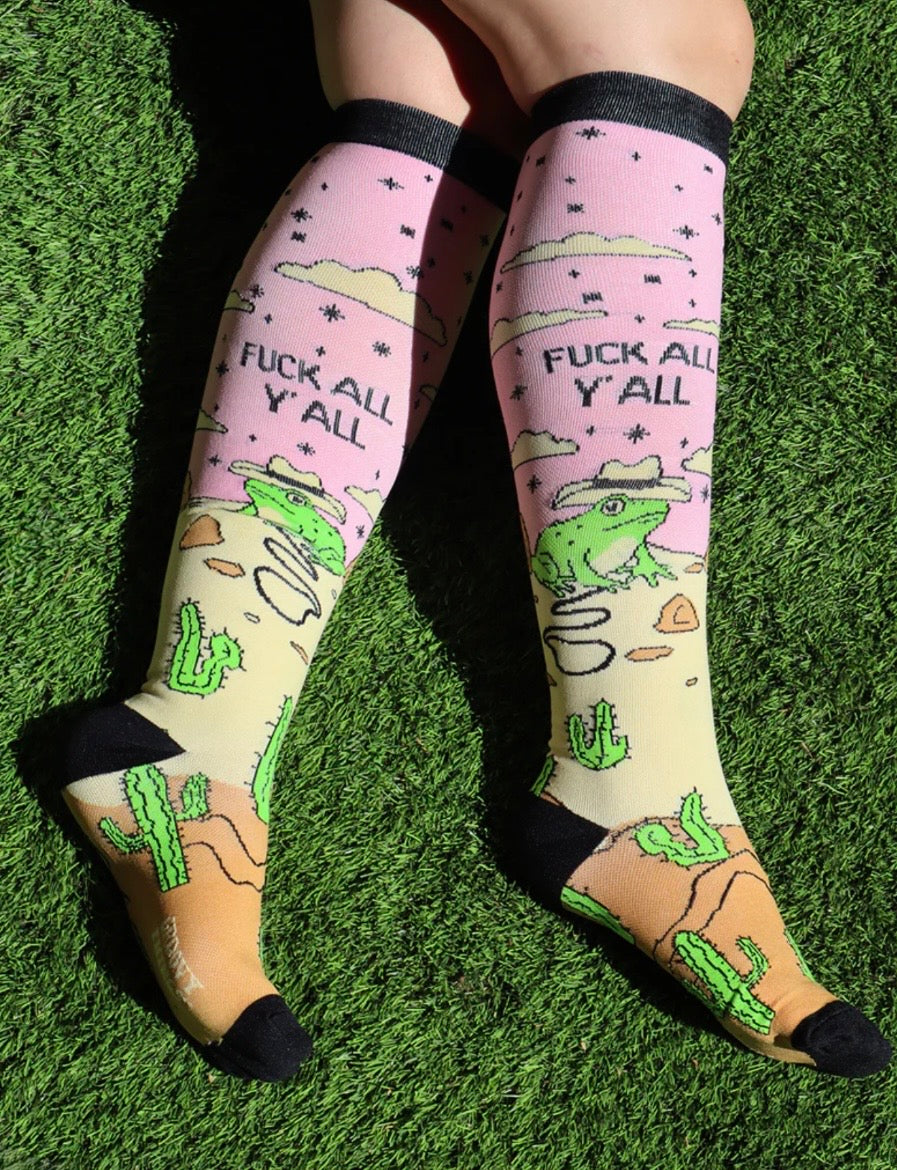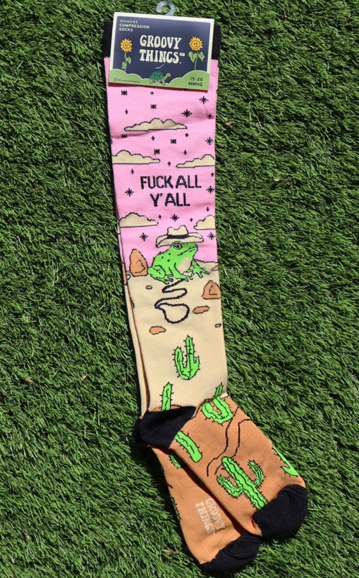 {"id":10066926174514,"title":"FUCK ALL Y’ALL Ladies 15-20 mmHg Compression Socks GROOVY THINGS Brand","handle":"fuck-all-y-all-ladies-15-20-mmhg-compression-socks-groovy-things-brand","description":"\u003cp\u003eFuck All Y'all 🐸🌵\u003c\/p\u003e\n\u003cp\u003eGROOVY THINGS Brand Ladies Compression Socks\u003c\/p\u003e\n\u003cp\u003eOur 15–20 mmHg compression socks provide just the right amount of support to boost circulation, reduce fatigue, and keep your legs feeling energized all day. Whether you're on your feet, in the air, or at your desk, they can help prevent swelling and discomfort without sacrificing comfort or style.\u003c\/p\u003e\n\u003cul\u003e\n\u003cli\u003e15-20 MMHG Compression Level\u003c\/li\u003e\n\u003cli\u003e70% Nylon, 22% Elastic, 3% Spandex\u003c\/li\u003e\n\u003cli\u003eOne size fits most, Women’s Knee High length socks\u003cbr\u003e\n\u003c\/li\u003e\n\u003cli\u003eFits up to an 18 inch calf\u003c\/li\u003e\n\u003cli\u003eMachine wash cold, Tumble dry medium, Do not bleach\u003c\/li\u003e\n\u003c\/ul\u003e","published_at":"2025-12-15T08:27:37-05:00","created_at":"2025-12-15T08:24:56-05:00","vendor":"Novelty Socks And Slippers","type":"Compression Socks","tags":[],"price":2699,"price_min":2699,"price_max":2699,"available":true,"price_varies":false,"compare_at_price":null,"compare_at_price_min":0,"compare_at_price_max":0,"compare_at_price_varies":false,"variants":[{"id":50732231131442,"title":"Default Title","option1":"Default Title","option2":null,"option3":null,"sku":null,"requires_shipping":true,"taxable":false,"featured_image":null,"available":true,"name":"FUCK ALL Y’ALL Ladies 15-20 mmHg Compression Socks GROOVY THINGS Brand","public_title":null,"options":["Default Title"],"price":2699,"weight":57,"compare_at_price":null,"inventory_management":"shopify","barcode":null,"requires_selling_plan":false,"selling_plan_allocations":[]}],"images":["\/\/noveltysocksforless.com\/cdn\/shop\/files\/31ADB30A-E292-430A-9EA5-6D74D9F73815.jpg?v=1765805112","\/\/noveltysocksforless.com\/cdn\/shop\/files\/A66347BE-F475-45E4-84DC-C08DB0DC0F38.jpg?v=1765805112","\/\/noveltysocksforless.com\/cdn\/shop\/files\/189A888A-E45F-4E7F-997E-3BA3C01FF5E9.jpg?v=1765805112"],"featured_image":"\/\/noveltysocksforless.com\/cdn\/shop\/files\/31ADB30A-E292-430A-9EA5-6D74D9F73815.jpg?v=1765805112","options":["Title"],"media":[{"alt":null,"id":42843151139122,"position":1,"preview_image":{"aspect_ratio":0.558,"height":1052,"width":587,"src":"\/\/noveltysocksforless.com\/cdn\/shop\/files\/31ADB30A-E292-430A-9EA5-6D74D9F73815.jpg?v=1765805112"},"aspect_ratio":0.558,"height":1052,"media_type":"image","src":"\/\/noveltysocksforless.com\/cdn\/shop\/files\/31ADB30A-E292-430A-9EA5-6D74D9F73815.jpg?v=1765805112","width":587},{"alt":null,"id":42843151106354,"position":2,"preview_image":{"aspect_ratio":0.767,"height":1170,"width":897,"src":"\/\/noveltysocksforless.com\/cdn\/shop\/files\/A66347BE-F475-45E4-84DC-C08DB0DC0F38.jpg?v=1765805112"},"aspect_ratio":0.767,"height":1170,"media_type":"image","src":"\/\/noveltysocksforless.com\/cdn\/shop\/files\/A66347BE-F475-45E4-84DC-C08DB0DC0F38.jpg?v=1765805112","width":897},{"alt":null,"id":42843151073586,"position":3,"preview_image":{"aspect_ratio":0.621,"height":1177,"width":731,"src":"\/\/noveltysocksforless.com\/cdn\/shop\/files\/189A888A-E45F-4E7F-997E-3BA3C01FF5E9.jpg?v=1765805112"},"aspect_ratio":0.621,"height":1177,"media_type":"image","src":"\/\/noveltysocksforless.com\/cdn\/shop\/files\/189A888A-E45F-4E7F-997E-3BA3C01FF5E9.jpg?v=1765805112","width":731}],"requires_selling_plan":false,"selling_plan_groups":[],"content":"\u003cp\u003eFuck All Y'all 🐸🌵\u003c\/p\u003e\n\u003cp\u003eGROOVY THINGS Brand Ladies Compression Socks\u003c\/p\u003e\n\u003cp\u003eOur 15–20 mmHg compression socks provide just the right amount of support to boost circulation, reduce fatigue, and keep your legs feeling energized all day. Whether you're on your feet, in the air, or at your desk, they can help prevent swelling and discomfort without sacrificing comfort or style.\u003c\/p\u003e\n\u003cul\u003e\n\u003cli\u003e15-20 MMHG Compression Level\u003c\/li\u003e\n\u003cli\u003e70% Nylon, 22% Elastic, 3% Spandex\u003c\/li\u003e\n\u003cli\u003eOne size fits most, Women’s Knee High length socks\u003cbr\u003e\n\u003c\/li\u003e\n\u003cli\u003eFits up to an 18 inch calf\u003c\/li\u003e\n\u003cli\u003eMachine wash cold, Tumble dry medium, Do not bleach\u003c\/li\u003e\n\u003c\/ul\u003e"}