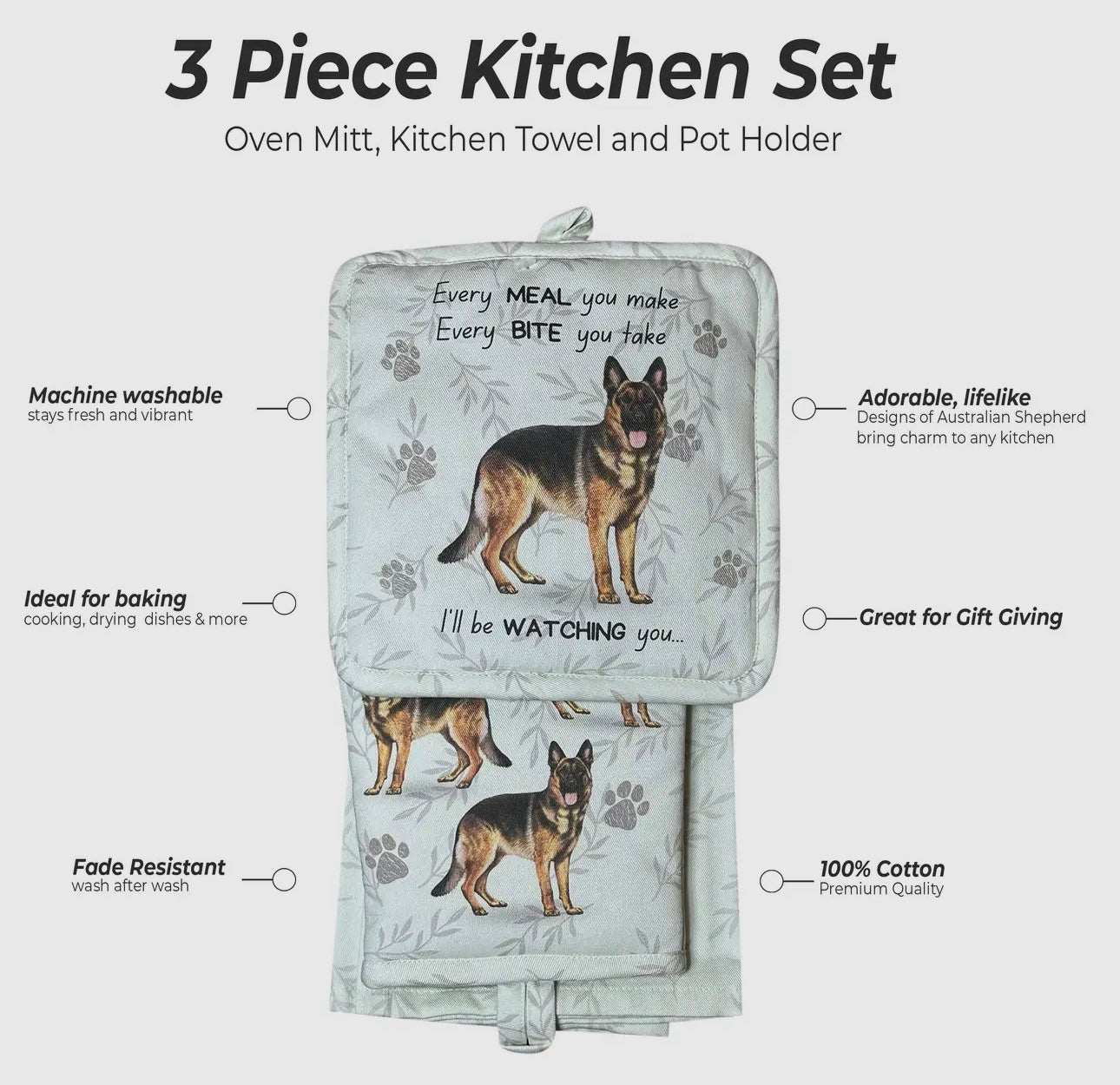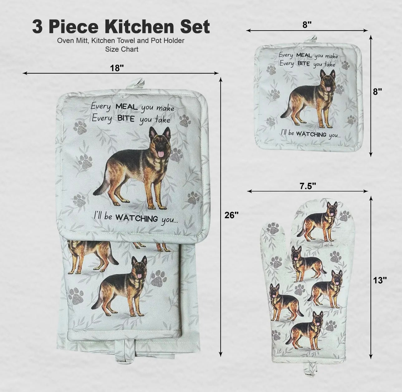GERMAN SHEPHERD Dog 3-Piece Kitchen Set - Oven Mitt, Pot Holder & Kitchen Towel Set, Heat Resistant up to 420 F, Soft Quilted Cotton for Cooking, Baking, BBQ, Pet Lover Gifts