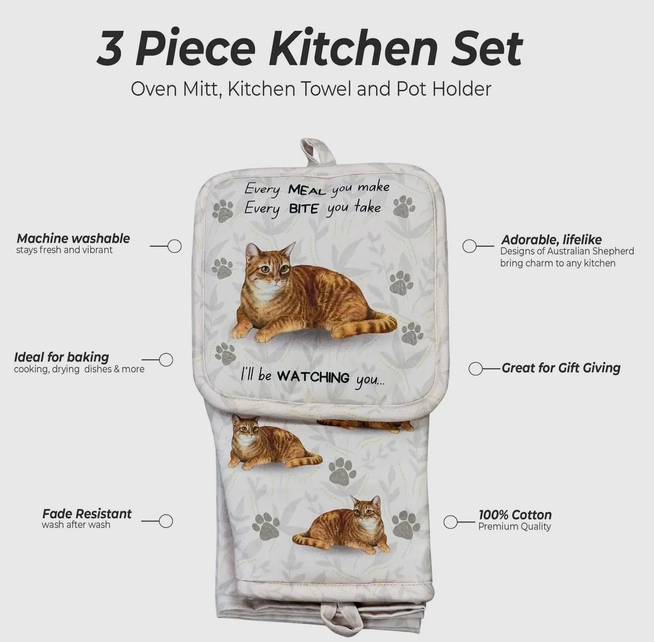 {"id":10034087199026,"title":"ORANGE TABBY Cat 3 Piece Oven Mitt \u0026 Tea Towel Set By E\u0026S Pets","handle":"orange-tabby-cat-oven","description":"\u003cp\u003e\u003cstrong\u003e\u003cspan class=\"a-size-large product-title-word-break\" id=\"productTitle\"\u003eORANGE TABBY Cat 3-Piece Kitchen Set - Oven Mitt, Pot Holder \u0026amp; Kitchen Towel Set, Heat Resistant up to 420 F, Soft Quilted Cotton for Cooking, Baking, BBQ, Pet Lover Gifts\u003c\/span\u003e\u003c\/strong\u003e\u003c\/p\u003e\n\u003cp\u003e\u003cspan\u003eOur 100% cotton Machine Washable Kitchen set includes Oven mitt, Pot holder and Kitchen Towel that brings luxury with softness and style.\u003c\/span\u003e\u003c\/p\u003e\n\u003cp\u003e\u003cspan\u003e\u003cstrong\u003eEvery Meal You Make Every Bite You Take... I'll Be Watching You, Funny Dog Sentiment\u003c\/strong\u003e\u003c\/span\u003e\u003c\/p\u003e\n\u003cp\u003e\u003cspan\u003eOur versatile collection ensures a perfect fit for everyone, reflecting simplicity and quality in every thread.\u003c\/span\u003e\u003c\/p\u003e\n\u003cp\u003e\u003cspan\u003eMakes A Perfect Gift For Any Pet Lover!\u003c\/span\u003e\u003c\/p\u003e\n\u003cp\u003e\u003cspan\u003eBY E\u0026amp;S PETS\u003c\/span\u003e\u003c\/p\u003e","published_at":"2025-11-04T18:44:30-05:00","created_at":"2025-11-04T18:42:15-05:00","vendor":"Novelty Socks And Slippers","type":"","tags":[],"price":2599,"price_min":2599,"price_max":2599,"available":true,"price_varies":false,"compare_at_price":null,"compare_at_price_min":0,"compare_at_price_max":0,"compare_at_price_varies":false,"variants":[{"id":50601022718258,"title":"Default Title","option1":"Default Title","option2":null,"option3":null,"sku":"312-8","requires_shipping":true,"taxable":true,"featured_image":null,"available":true,"name":"ORANGE TABBY Cat 3 Piece Oven Mitt \u0026 Tea Towel Set By E\u0026S Pets","public_title":null,"options":["Default Title"],"price":2599,"weight":283,"compare_at_price":null,"inventory_management":"shopify","barcode":"721718473329","requires_selling_plan":false,"selling_plan_allocations":[]}],"images":["\/\/noveltysocksforless.com\/cdn\/shop\/files\/3C1A2342-E867-4E54-BAC4-FD0EAB6E9617.jpg?v=1762479609","\/\/noveltysocksforless.com\/cdn\/shop\/files\/ABF62406-B7CD-41BA-B0F9-2DECEBB4147F.jpg?v=1762479609","\/\/noveltysocksforless.com\/cdn\/shop\/files\/A4885810-3ADC-46A6-81B3-C9C2622CF739.jpg?v=1762479609","\/\/noveltysocksforless.com\/cdn\/shop\/files\/74724CAA-3A58-42A4-9A89-F786E66025EE.jpg?v=1762479609"],"featured_image":"\/\/noveltysocksforless.com\/cdn\/shop\/files\/3C1A2342-E867-4E54-BAC4-FD0EAB6E9617.jpg?v=1762479609","options":["Title"],"media":[{"alt":"ORANGE TABBY Cat 3 Piece Oven Mitt \u0026 Tea Towel Set By E\u0026S Pets - Novelty Socks And Slippers","id":42585412141362,"position":1,"preview_image":{"aspect_ratio":0.631,"height":1039,"width":656,"src":"\/\/noveltysocksforless.com\/cdn\/shop\/files\/3C1A2342-E867-4E54-BAC4-FD0EAB6E9617.jpg?v=1762479609"},"aspect_ratio":0.631,"height":1039,"media_type":"image","src":"\/\/noveltysocksforless.com\/cdn\/shop\/files\/3C1A2342-E867-4E54-BAC4-FD0EAB6E9617.jpg?v=1762479609","width":656},{"alt":"ORANGE TABBY Cat 3 Piece Oven Mitt \u0026 Tea Towel Set By E\u0026S Pets - Novelty Socks And Slippers","id":42570765435186,"position":2,"preview_image":{"aspect_ratio":1.018,"height":1267,"width":1290,"src":"\/\/noveltysocksforless.com\/cdn\/shop\/files\/ABF62406-B7CD-41BA-B0F9-2DECEBB4147F.jpg?v=1762479609"},"aspect_ratio":1.018,"height":1267,"media_type":"image","src":"\/\/noveltysocksforless.com\/cdn\/shop\/files\/ABF62406-B7CD-41BA-B0F9-2DECEBB4147F.jpg?v=1762479609","width":1290},{"alt":"ORANGE TABBY Cat 3 Piece Oven Mitt \u0026 Tea Towel Set By E\u0026S Pets - Novelty Socks And Slippers","id":42570765402418,"position":3,"preview_image":{"aspect_ratio":0.781,"height":1652,"width":1290,"src":"\/\/noveltysocksforless.com\/cdn\/shop\/files\/A4885810-3ADC-46A6-81B3-C9C2622CF739.jpg?v=1762479609"},"aspect_ratio":0.781,"height":1652,"media_type":"image","src":"\/\/noveltysocksforless.com\/cdn\/shop\/files\/A4885810-3ADC-46A6-81B3-C9C2622CF739.jpg?v=1762479609","width":1290},{"alt":null,"id":42460908519730,"position":4,"preview_image":{"aspect_ratio":0.627,"height":466,"width":292,"src":"\/\/noveltysocksforless.com\/cdn\/shop\/files\/preview_images\/5d30ca4f2f8e4696a7f829d86adabf8d.thumbnail.0000000000.jpg?v=1761525000"},"aspect_ratio":0.625,"duration":15630,"media_type":"video","sources":[{"format":"mp4","height":480,"mime_type":"video\/mp4","url":"\/\/noveltysocksforless.com\/cdn\/shop\/videos\/c\/vp\/5d30ca4f2f8e4696a7f829d86adabf8d\/5d30ca4f2f8e4696a7f829d86adabf8d.SD-480p-0.9Mbps-60945771.mp4?v=0","width":300}]},{"alt":"ORANGE TABBY Cat 3 Piece Oven Mitt \u0026 Tea Towel Set By E\u0026S Pets - Novelty Socks And Slippers","id":42570765467954,"position":5,"preview_image":{"aspect_ratio":0.579,"height":1052,"width":609,"src":"\/\/noveltysocksforless.com\/cdn\/shop\/files\/74724CAA-3A58-42A4-9A89-F786E66025EE.jpg?v=1762479609"},"aspect_ratio":0.579,"height":1052,"media_type":"image","src":"\/\/noveltysocksforless.com\/cdn\/shop\/files\/74724CAA-3A58-42A4-9A89-F786E66025EE.jpg?v=1762479609","width":609}],"requires_selling_plan":false,"selling_plan_groups":[],"content":"\u003cp\u003e\u003cstrong\u003e\u003cspan class=\"a-size-large product-title-word-break\" id=\"productTitle\"\u003eORANGE TABBY Cat 3-Piece Kitchen Set - Oven Mitt, Pot Holder \u0026amp; Kitchen Towel Set, Heat Resistant up to 420 F, Soft Quilted Cotton for Cooking, Baking, BBQ, Pet Lover Gifts\u003c\/span\u003e\u003c\/strong\u003e\u003c\/p\u003e\n\u003cp\u003e\u003cspan\u003eOur 100% cotton Machine Washable Kitchen set includes Oven mitt, Pot holder and Kitchen Towel that brings luxury with softness and style.\u003c\/span\u003e\u003c\/p\u003e\n\u003cp\u003e\u003cspan\u003e\u003cstrong\u003eEvery Meal You Make Every Bite You Take... I'll Be Watching You, Funny Dog Sentiment\u003c\/strong\u003e\u003c\/span\u003e\u003c\/p\