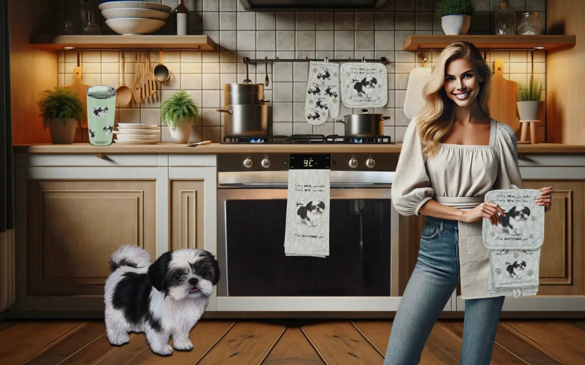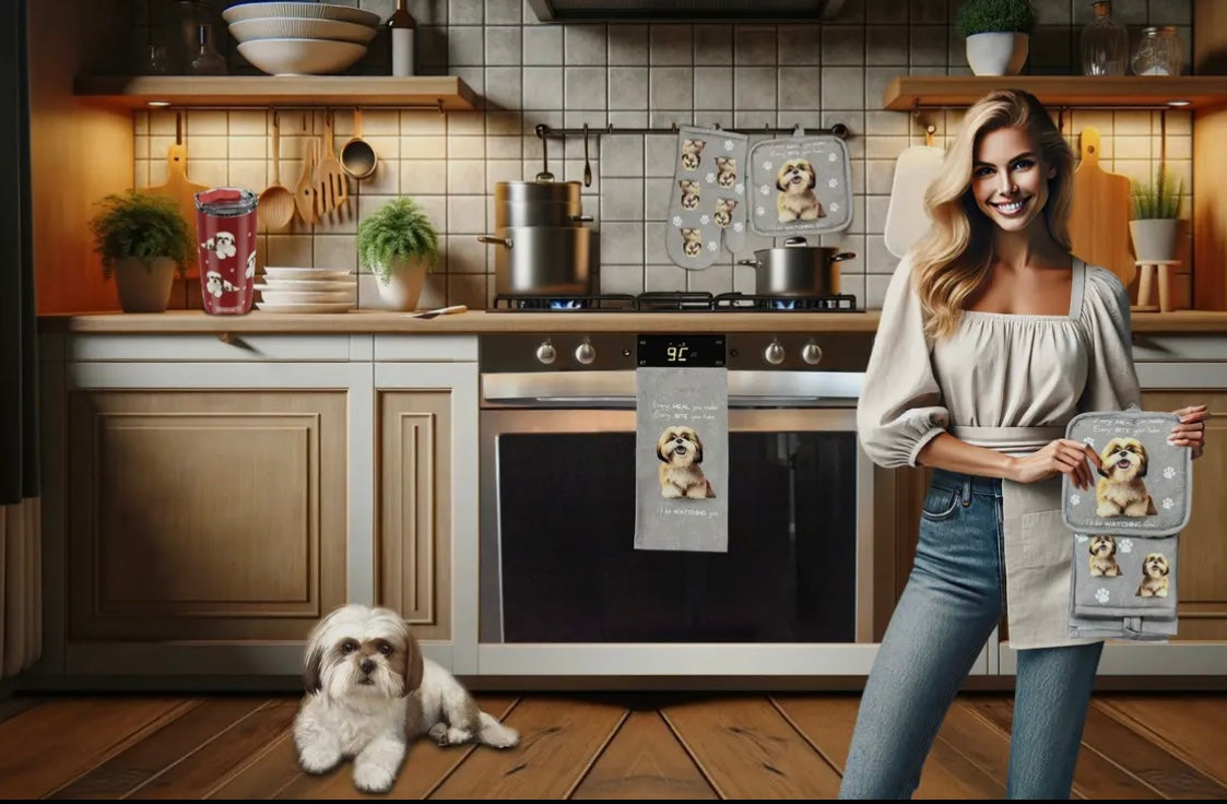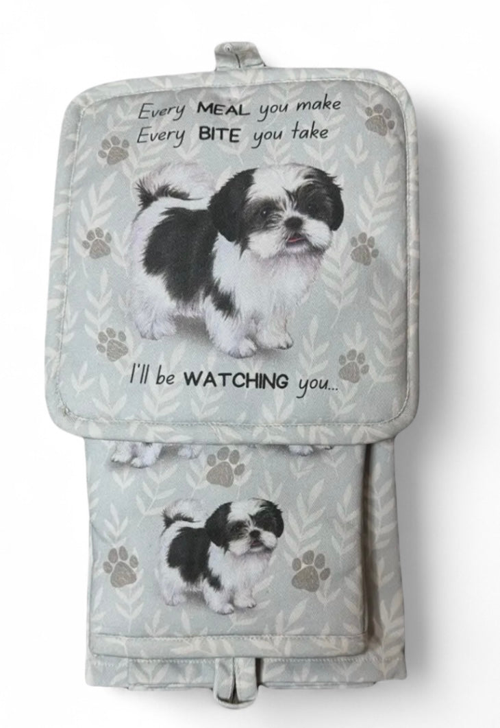 SHIH TZU Dog 3 Piece Oven Mitt & Tea Towel Set By E&S Pets (CHOOSE BEIGE OR BLACK & WHITE DOG)