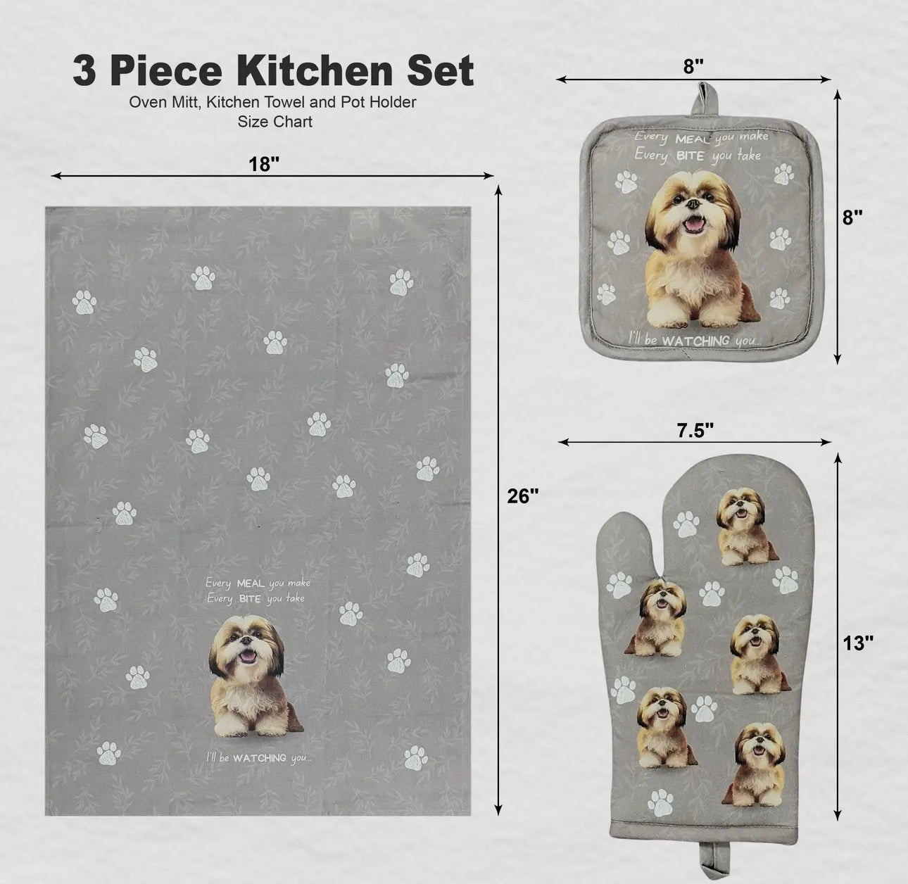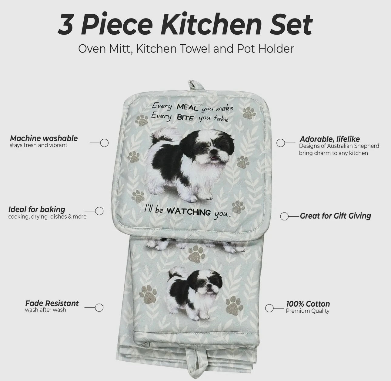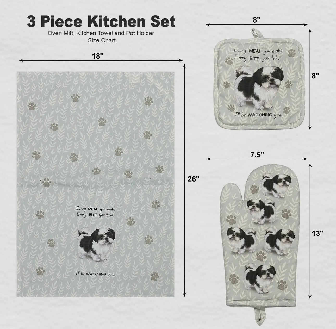 SHIH TZU Dog (Choose Beige Dog Or Black & White Dog) 3-Piece Kitchen Set - Oven Mitt, Pot Holder & Kitchen Towel Set, Heat Resistant up to 420 F, Soft Quilted Cotton for Cooking, Baking, BBQ, Pet Lover Gifts