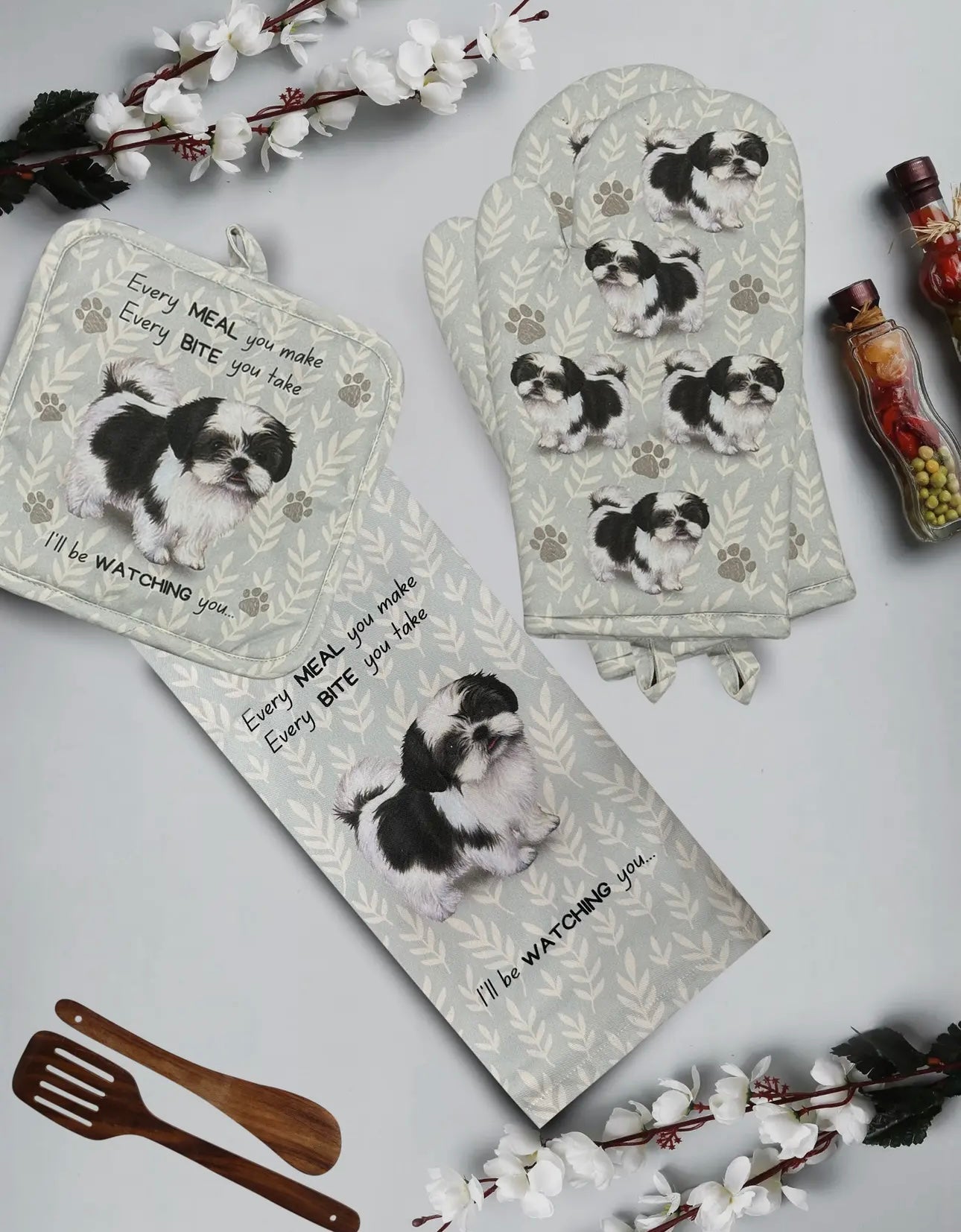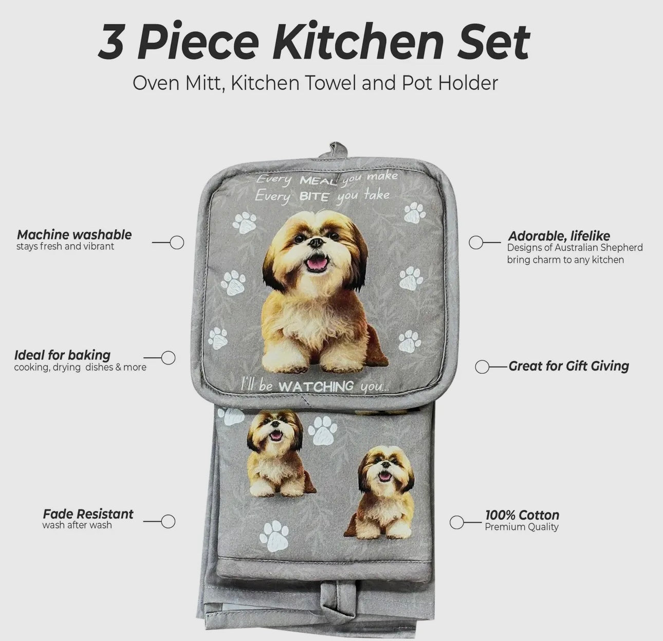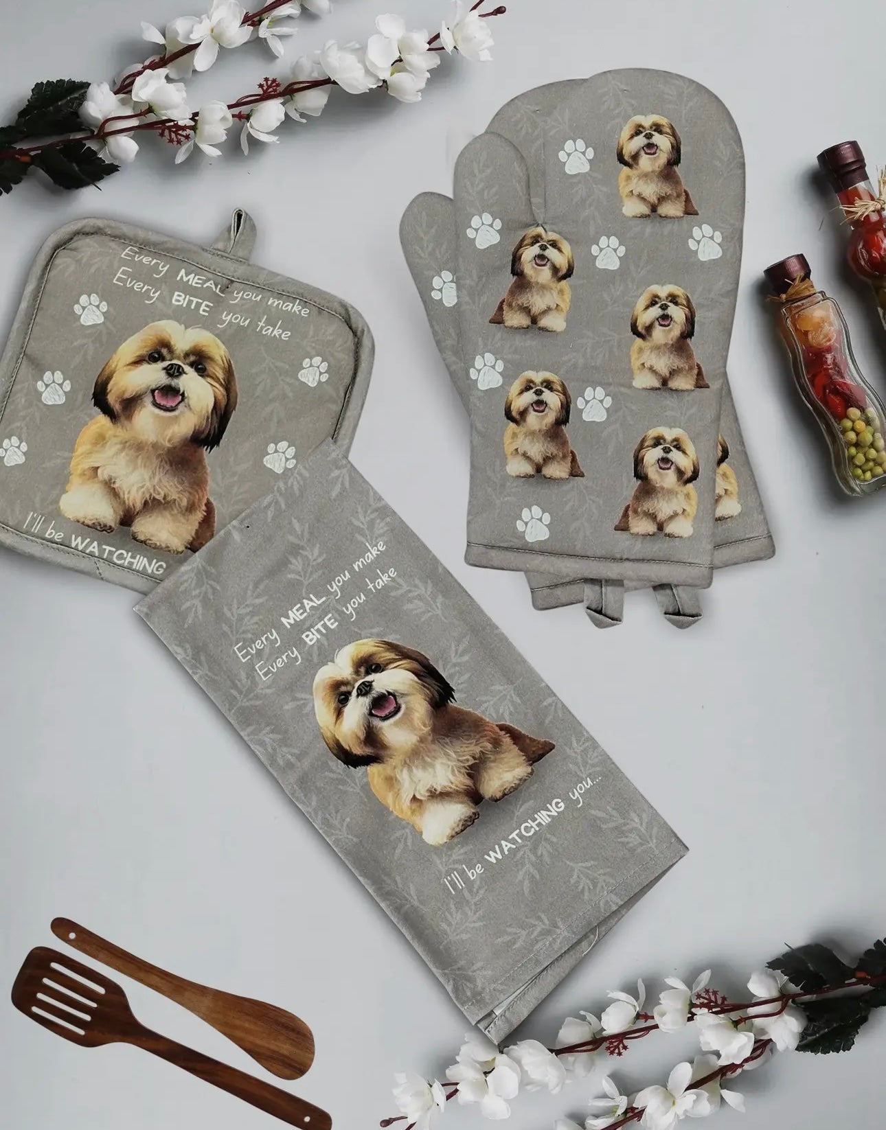 SHIH TZU Dog (Choose Beige Dog Or Black & White Dog) 3-Piece Kitchen Set - Oven Mitt, Pot Holder & Kitchen Towel Set, Heat Resistant up to 420 F, Soft Quilted Cotton for Cooking, Baking, BBQ, Pet Lover Gifts