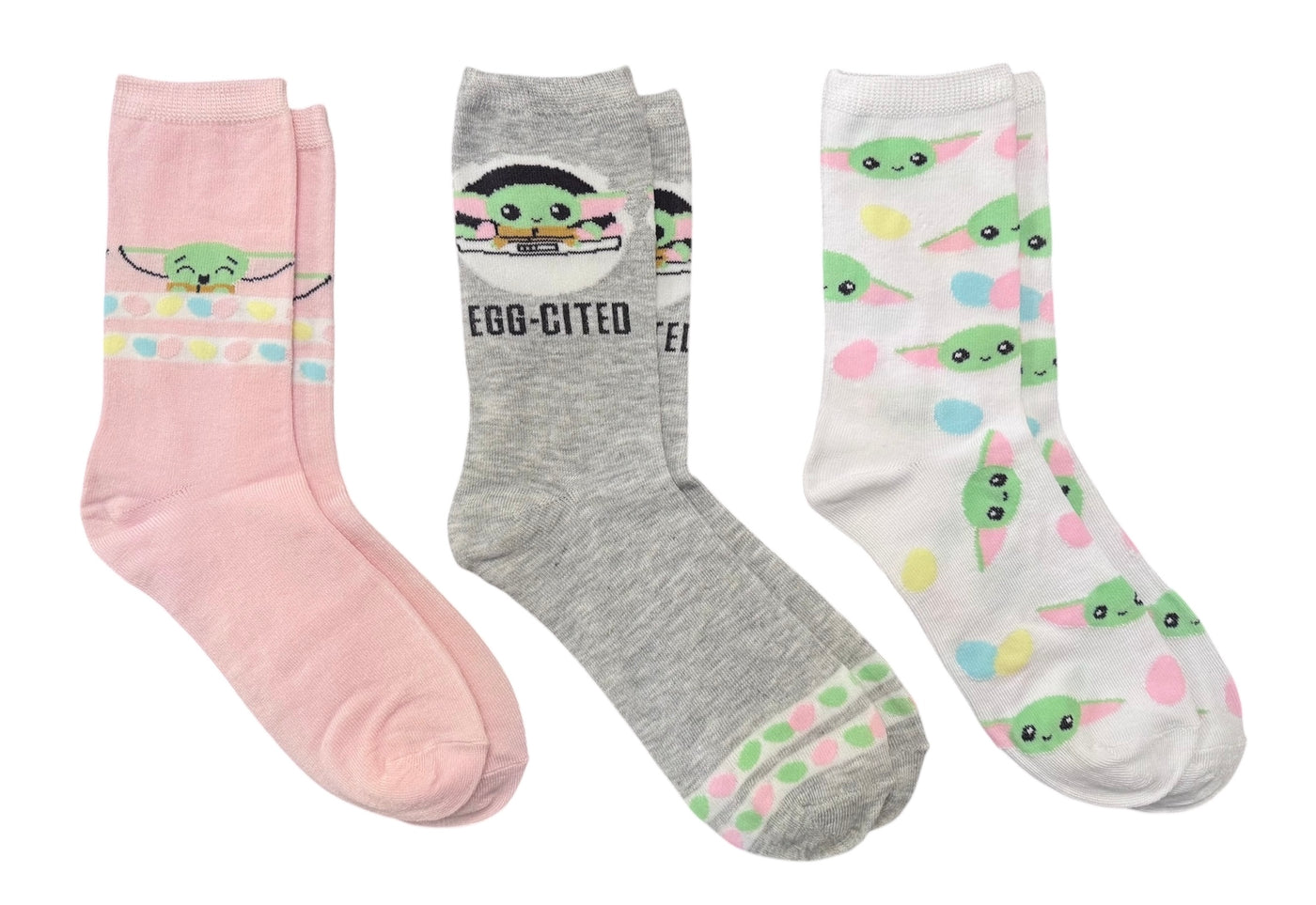 DISNEY’S STAR WARS THE MANDALORIAN Ladies 3 Pair Of BABY YODA EASTER Crew Socks Shoe Size 4-10