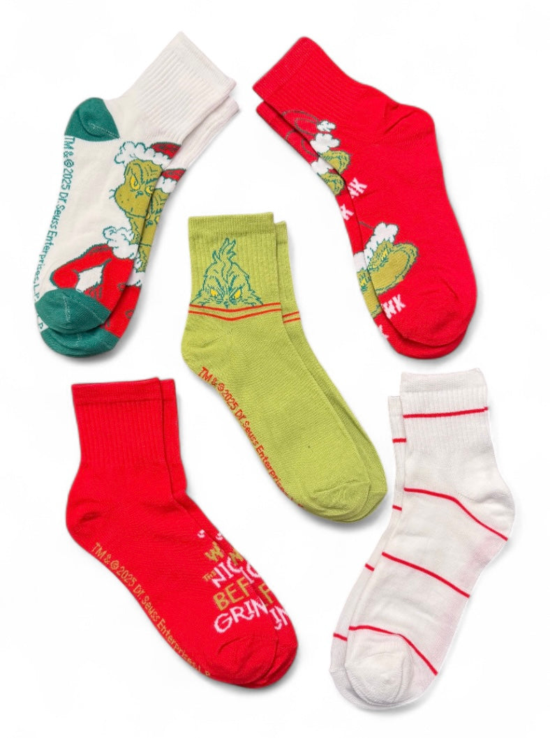 {"id":10015204344114,"title":"Dr. Seuss How The Grinch Stole Christmas Ladies 5 Pair Of Socks 'TWAS' THE NIGHT BEFORE GRINCHMAS'","handle":"dr-seuss","description":"\u003cp\u003eDR. SEUSS HOW THE GRINCH STOLE CHRISTMAS Ladies 5 Pair Of Christmas Crew Socks Shoe Size 5-10\u003c\/p\u003e\n\u003cp\u003e'TWAS' THE NIGHT BEFORE GRINCHMAS', 'STINK STANK STUNK'\u003c\/p\u003e\n\u003cp\u003e98% Polyester, 2% Spandex,\u003c\/p\u003e\n\u003cp\u003eBIOWORLD Brand\u003c\/p\u003e","published_at":"2025-10-26T18:37:29-04:00","created_at":"2025-10-26T18:34:20-04:00","vendor":"Novelty Socks And Slippers","type":"SOCKS","tags":[],"price":1899,"price_min":1899,"price_max":1899,"available":true,"price_varies":false,"compare_at_price":null,"compare_at_price_min":0,"compare_at_price_max":0,"compare_at_price_varies":false,"variants":[{"id":50549684502834,"title":"Default Title","option1":"Default Title","option2":null,"option3":null,"sku":null,"requires_shipping":true,"taxable":false,"featured_image":null,"available":true,"name":"Dr. Seuss How The Grinch Stole Christmas Ladies 5 Pair Of Socks 'TWAS' THE NIGHT BEFORE GRINCHMAS'","public_title":null,"options":["Default Title"],"price":1899,"weight":170,"compare_at_price":null,"inventory_management":"shopify","barcode":null,"requires_selling_plan":false,"selling_plan_allocations":[]}],"images":["\/\/noveltysocksforless.com\/cdn\/shop\/files\/23C4C19C-FF8F-442D-82B0-761139D761CA.jpg?v=1761518067"],"featured_image":"\/\/noveltysocksforless.com\/cdn\/shop\/files\/23C4C19C-FF8F-442D-82B0-761139D761CA.jpg?v=1761518067","options":["Title"],"media":[{"alt":"Dr. Seuss How The Grinch Stole Christmas Ladies 5 Pair Of Socks 'TWAS' THE NIGHT BEFORE GRINCHMAS' - Novelty Socks And Slippers","id":42460516614450,"position":1,"preview_image":{"aspect_ratio":0.745,"height":1058,"width":788,"src":"\/\/noveltysocksforless.com\/cdn\/shop\/files\/23C4C19C-FF8F-442D-82B0-761139D761CA.jpg?v=1761518067"},"aspect_ratio":0.745,"height":1058,"media_type":"image","src":"\/\/noveltysocksforless.com\/cdn\/shop\/files\/23C4C19C-FF8F-442D-82B0-761139D761CA.jpg?v=1761518067","width":788}],"requires_selling_plan":false,"selling_plan_groups":[],"content":"\u003cp\u003eDR. SEUSS HOW THE GRINCH STOLE CHRISTMAS Ladies 5 Pair Of Christmas Crew Socks Shoe Size 5-10\u003c\/p\u003e\n\u003cp\u003e'TWAS' THE NIGHT BEFORE GRINCHMAS', 'STINK STANK STUNK'\u003c\/p\u003e\n\u003cp\u003e98% Polyester, 2% Spandex,\u003c\/p\u003e\n\u003cp\u003eBIOWORLD Brand\u003c\/p\u003e"}