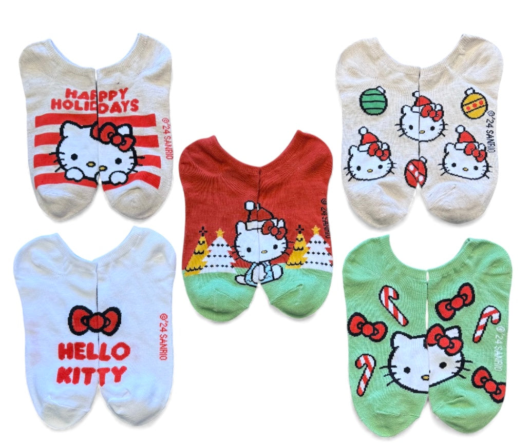 {"id":10042541015346,"title":"SANRIO HELLO KITTY Ladies Christmas 5 Pair Of No Show Socks","handle":"hello-kitty-ladies-christmas-5-pair-of-no-show-socks-my-melody","description":"\u003cp\u003eSANRIO HELLO KITTY Ladies 5 Pair Of CHRISTMAS No Show Socks Shoe Size 4-10\u003c\/p\u003e\n\u003cp\u003e98% Polyester, 2% Spandex \u003c\/p\u003e\n\u003cp\u003eHigh Point Design Brand \u003c\/p\u003e","published_at":"2025-11-14T09:22:57-05:00","created_at":"2025-11-14T09:19:42-05:00","vendor":"Novelty Socks And Slippers","type":"NO SHOW SOCKS","tags":[],"price":1199,"price_min":1199,"price_max":1199,"available":true,"price_varies":false,"compare_at_price":null,"compare_at_price_min":0,"compare_at_price_max":0,"compare_at_price_varies":false,"variants":[{"id":50626668200242,"title":"Default Title","option1":"Default Title","option2":null,"option3":null,"sku":"41094041P60646HP","requires_shipping":true,"taxable":false,"featured_image":null,"available":true,"name":"SANRIO HELLO KITTY Ladies Christmas 5 Pair Of No Show Socks","public_title":null,"options":["Default Title"],"price":1199,"weight":57,"compare_at_price":null,"inventory_management":"shopify","barcode":"086694713662","requires_selling_plan":false,"selling_plan_allocations":[]}],"images":["\/\/noveltysocksforless.com\/cdn\/shop\/files\/960A5E7C-DB5C-4CEC-9A37-080B85D77A24.jpg?v=1763129989"],"featured_image":"\/\/noveltysocksforless.com\/cdn\/shop\/files\/960A5E7C-DB5C-4CEC-9A37-080B85D77A24.jpg?v=1763129989","options":["Title"],"media":[{"alt":"HELLO KITTY Ladies Christmas 5 Pair Of No Show Socks My Melody - Novelty Socks And Slippers","id":42629335286066,"position":1,"preview_image":{"aspect_ratio":1.183,"height":872,"width":1032,"src":"\/\/noveltysocksforless.com\/cdn\/shop\/files\/960A5E7C-DB5C-4CEC-9A37-080B85D77A24.jpg?v=1763129989"},"aspect_ratio":1.183,"height":872,"media_type":"image","src":"\/\/noveltysocksforless.com\/cdn\/shop\/files\/960A5E7C-DB5C-4CEC-9A37-080B85D77A24.jpg?v=1763129989","width":1032}],"requires_selling_plan":false,"selling_plan_groups":[],"content":"\u003cp\u003eSANRIO HELLO KITTY Ladies 5 Pair Of CHRISTMAS No Show Socks Shoe Size 4-10\u003c\/p\u003e\n\u003cp\u003e98% Polyester, 2% Spandex \u003c\/p\u003e\n\u003cp\u003eHigh Point Design Brand \u003c\/p\u003e"}