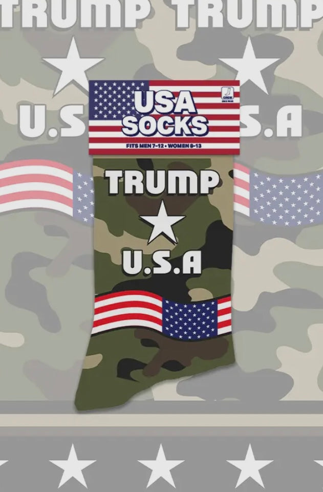 {"id":9897466626354,"title":"President Trump Camo Unisex Socks USA Cool Socks Brand","handle":"president-trump-camo-unisex-socks-usa-cool-socks-brand","description":"\u003cp\u003e\u003cspan\u003ePRESIDENT TRUMP CAMO Unisex Crew Socks \u003c\/span\u003e\u003c\/p\u003e\n\u003cp\u003e\u003cspan\u003eMen's Shoe Size 7-12, Women's Shoe Size 8-13\u003c\/span\u003e\u003c\/p\u003e\n\u003cp\u003e\u003cspan\u003e52% Polyester, 45% Cotton, 3% Spandex\u003c\/span\u003e\u003c\/p\u003e\n\u003cp\u003e\u003cspan\u003eOur Trump Camo USA - Crew Folded socks are more than just a comfort staple. As a product of Cool Socks, we believe in standing out and being ODD. \u003c\/span\u003e\u003c\/p\u003e\n\u003cp\u003e\u003cspan\u003eThese socks are a testament to that belief, offering a unique design that goes against the grain of conformity. Wear your individuality proudly, stepping away from the norm and into the world of distinctive style. \u003c\/span\u003e\u003c\/p\u003e\n\u003cp\u003e\u003cspan\u003eStand out, be ODD, choose Cool Socks.\u003c\/span\u003e\u003c\/p\u003e","published_at":"2025-06-27T20:01:38-04:00","created_at":"2025-06-27T19:59:16-04:00","vendor":"Novelty Socks And Slippers","type":"SOCKS","tags":[],"price":1299,"price_min":1299,"price_max":1299,"available":true,"price_varies":false,"compare_at_price":null,"compare_at_price_min":0,"compare_at_price_max":0,"compare_at_price_varies":false,"variants":[{"id":50164713259314,"title":"Default Title","option1":"Default Title","option2":null,"option3":null,"sku":"40642MNCFU","requires_shipping":true,"taxable":false,"featured_image":null,"available":true,"name":"President Trump Camo Unisex Socks USA Cool Socks Brand","public_title":null,"options":["Default Title"],"price":1299,"weight":57,"compare_at_price":null,"inventory_management":"shopify","barcode":"740107106419","requires_selling_plan":false,"selling_plan_allocations":[]}],"images":["\/\/noveltysocksforless.com\/cdn\/shop\/files\/CF5145B1-7E6F-49A4-A80A-099C93C3C46E.jpg?v=1754006369","\/\/noveltysocksforless.com\/cdn\/shop\/files\/93271412-BDA7-476E-B85B-355CF2986209.jpg?v=1754006359","\/\/noveltysocksforless.com\/cdn\/shop\/files\/ABB83C40-EFC0-4624-AFA9-84592D8AA88B.jpg?v=1754006359"],"featured_image":"\/\/noveltysocksforless.com\/cdn\/shop\/files\/CF5145B1-7E6F-49A4-A80A-099C93C3C46E.jpg?v=1754006369","options":["Title"],"media":[{"alt":"President Trump Camo Unisex Socks USA Cool Socks Brand - Novelty Socks And Slippers","id":41938814337330,"position":1,"preview_image":{"aspect_ratio":0.733,"height":1176,"width":862,"src":"\/\/noveltysocksforless.com\/cdn\/shop\/files\/CF5145B1-7E6F-49A4-A80A-099C93C3C46E.jpg?v=1754006369"},"aspect_ratio":0.733,"height":1176,"media_type":"image","src":"\/\/noveltysocksforless.com\/cdn\/shop\/files\/CF5145B1-7E6F-49A4-A80A-099C93C3C46E.jpg?v=1754006369","width":862},{"alt":"President Trump Camo Unisex Socks USA Cool Socks Brand - Novelty Socks And Slippers","id":41765310136626,"position":2,"preview_image":{"aspect_ratio":0.634,"height":965,"width":612,"src":"\/\/noveltysocksforless.com\/cdn\/shop\/files\/93271412-BDA7-476E-B85B-355CF2986209.jpg?v=1754006359"},"aspect_ratio":0.634,"height":965,"media_type":"image","src":"\/\/noveltysocksforless.com\/cdn\/shop\/files\/93271412-BDA7-476E-B85B-355CF2986209.jpg?v=1754006359","width":612},{"alt":"President Trump Camo Unisex Socks USA Cool Socks Brand - Novelty Socks And Slippers","id":41765310103858,"position":3,"preview_image":{"aspect_ratio":0.657,"height":961,"width":631,"src":"\/\/noveltysocksforless.com\/cdn\/shop\/files\/ABB83C40-EFC0-4624-AFA9-84592D8AA88B.jpg?v=1754006359"},"aspect_ratio":0.657,"height":961,"media_type":"image","src":"\/\/noveltysocksforless.com\/cdn\/shop\/files\/ABB83C40-EFC0-4624-AFA9-84592D8AA88B.jpg?v=1754006359","width":631}],"requires_selling_plan":false,"selling_plan_groups":[],"content":"\u003cp\u003e\u003cspan\u003ePRESIDENT TRUMP CAMO Unisex Crew Socks \u003c\/span\u003e\u003c\/p\u003e\n\u003cp\u003e\u003cspan\u003eMen's Shoe Size 7-12, Women's Shoe Size 8-13\u003c\/span\u003e\u003c\/p\u003e\n\u003cp\u003e\u003cspan\u003e52% Polyester, 45% Cotton, 3% Spandex\u003c\/span\u003e\u003c\/p\u003e\n\u003cp\u003e\u003cspan\u003eOur Trump Camo USA - Crew Folded socks are more than just a comfort staple. As a product of Cool Socks, we believe in standing out and being ODD. \u003c\/span\u003e\u003c\/p\u003e\n\u003cp\u003e\u003cspan\u003eThese socks are a testament to that belief, offering a unique design that goes against the grain of conformity. Wear your individuality proudly, stepping away from the norm and into the world of distinctive style. \u003c\/span\u003e\u003c\/p\u003e\n\u003cp\u003e\u003cspan\u003eStand out, be ODD, choose Cool Socks.\u003c\/span\u003e\u003c\/p\u003e"}