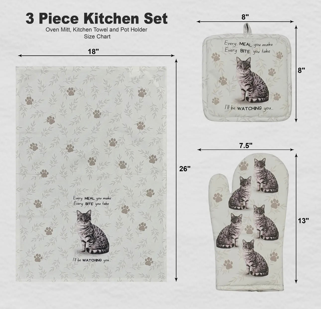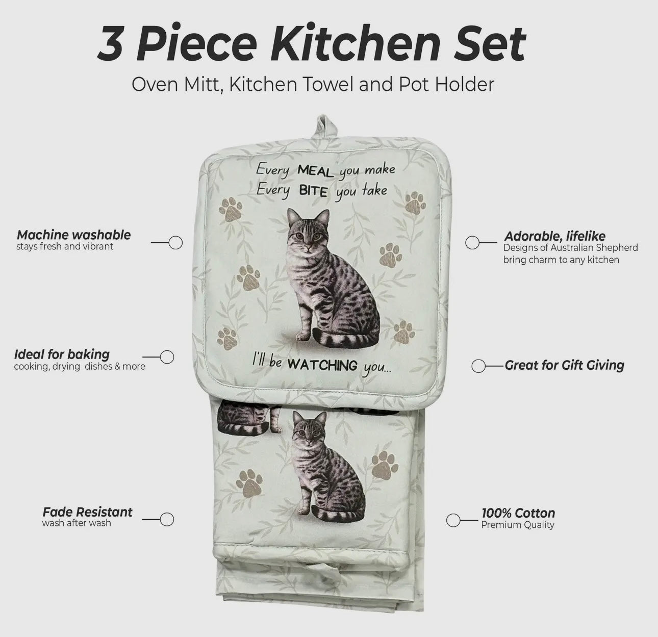 SILVER GRAY TABBY CAT 3-Piece Kitchen Set - Oven Mitt, Pot Holder & Kitchen Towel Set, Heat Resistant up to 420 F, Soft Quilted Cotton for Cooking, Baking, BBQ, Pet Lover Gifts
