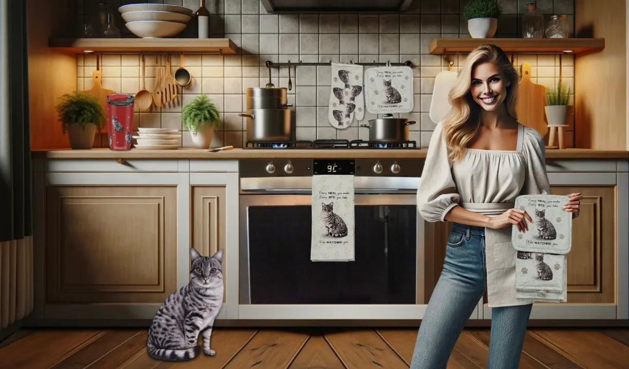 TABBY CAT 3 Piece Oven Mitt & Tea Towel Set By E&S Pets
