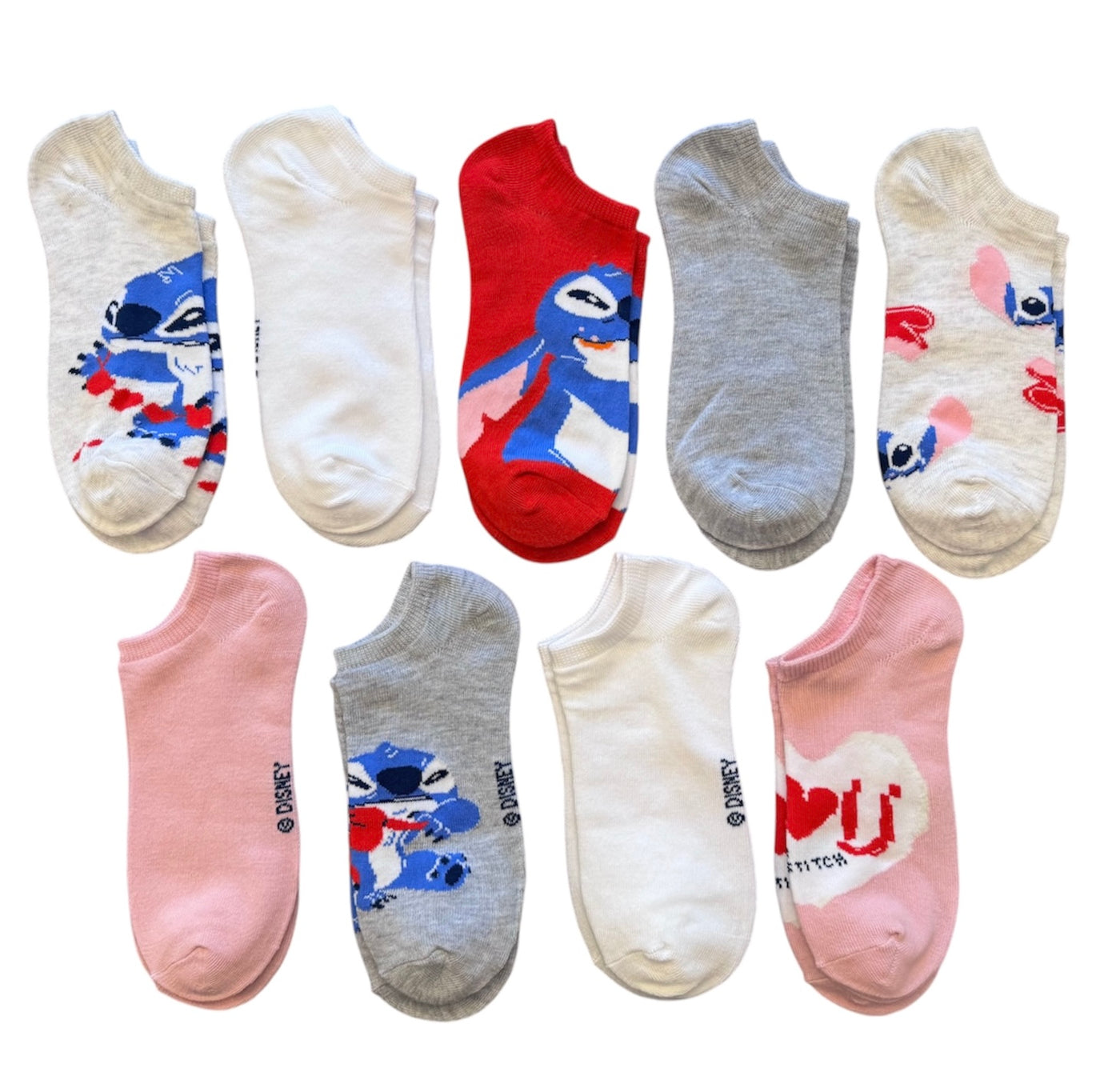 {"id":8672921518386,"title":"DISNEY STITCH VALENTINES DAY Ladies 9 Pair Of Low Show Socks ‘I LOVE YOU’","handle":"disney-lilo-stitch-halloween-ladies-9-pair-of-low-show-socks-stitch-as-a-witch","description":"\u003cp\u003eDISNEY’S LILO \u0026amp; STITCH Ladies 9 Pair Of VALENTINE’S DAY Low Show Socks Shoe Size 4-10\u003c\/p\u003e\n\u003cp\u003eSTITCH With Hearts, ‘I ❤️ U’\u003c\/p\u003e\n\u003cp\u003e97% Polyester, 3% Spandex \u003c\/p\u003e\n\u003cp\u003eCentric Brand\u003c\/p\u003e","published_at":"2026-01-08T09:26:28-05:00","created_at":"2023-09-04T18:21:42-04:00","vendor":"Novelty Socks And Slippers","type":"LOW SHOW SOCKS","tags":[],"price":1699,"price_min":1699,"price_max":1699,"available":true,"price_varies":false,"compare_at_price":null,"compare_at_price_min":0,"compare_at_price_max":0,"compare_at_price_varies":false,"variants":[{"id":46702903984434,"title":"Default Title","option1":"Default Title","option2":null,"option3":null,"sku":"43LO984XNSZA-WTH","requires_shipping":true,"taxable":false,"featured_image":null,"available":true,"name":"DISNEY STITCH VALENTINES DAY Ladies 9 Pair Of Low Show Socks ‘I LOVE YOU’","public_title":null,"options":["Default Title"],"price":1699,"weight":227,"compare_at_price":null,"inventory_management":"shopify","barcode":"193159467159","requires_selling_plan":false,"selling_plan_allocations":[]}],"images":["\/\/noveltysocksforless.com\/cdn\/shop\/files\/30718EB8-3CAB-4645-91B9-C028D96BF103.jpg?v=1767882221"],"featured_image":"\/\/noveltysocksforless.com\/cdn\/shop\/files\/30718EB8-3CAB-4645-91B9-C028D96BF103.jpg?v=1767882221","options":["Title"],"media":[{"alt":null,"id":42975977636146,"position":1,"preview_image":{"aspect_ratio":1.049,"height":1393,"width":1461,"src":"\/\/noveltysocksforless.com\/cdn\/shop\/files\/30718EB8-3CAB-4645-91B9-C028D96BF103.jpg?v=1767882221"},"aspect_ratio":1.049,"height":1393,"media_type":"image","src":"\/\/noveltysocksforless.com\/cdn\/shop\/files\/30718EB8-3CAB-4645-91B9-C028D96BF103.jpg?v=1767882221","width":1461}],"requires_selling_plan":false,"selling_plan_groups":[],"content":"\u003cp\u003eDISNEY’S LILO \u0026amp; STITCH Ladies 9 Pair Of VALENTINE’S DAY Low Show Socks Shoe Size 4-10\u003c\/p\u003e\n\u003cp\u003eSTITCH With Hearts, ‘I ❤️ U’\u003c\/p\u003e\n\u003cp\u003e97% Polyester, 3% Spandex \u003c\/p\u003e\n\u003cp\u003eCentric Brand\u003c\/p\u003e"}