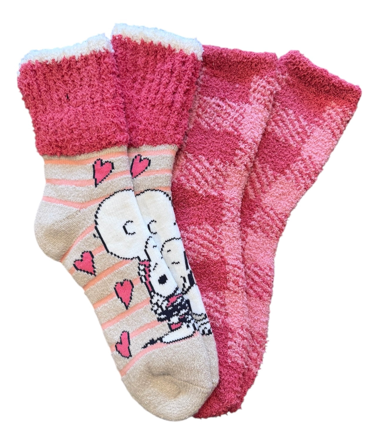 {"id":10080808206642,"title":"PEANUTS Ladies VALENTINES DAY 2 Pair Of Fuzzy Warm Socks Charlie Brown, Snoopy \u0026 Hearts","handle":"peanuts-ladies-valentines-day-2-pair-of-fuzzy-warm-socks-charlie-brown-snoopy-hearts","description":"\u003cp\u003ePEANUTS Ladies 2 Pair Of VALENTINE'S DAY Fuzzy Plush Crew Socks Shoe Size 4-10, Sock Size 9-11\u003c\/p\u003e\n\u003cp\u003eSNOOPY \u0026amp; CHARLIE BROWN HUGGING, SURROUNDED BY HEARTS\u003c\/p\u003e\n\u003cp\u003e98% Polyester, 2% Spandex \u003c\/p\u003e","published_at":"2026-01-08T09:50:20-05:00","created_at":"2026-01-08T09:47:41-05:00","vendor":"Novelty Socks And Slippers","type":"Fuzzy socks","tags":[],"price":1299,"price_min":1299,"price_max":1299,"available":true,"price_varies":false,"compare_at_price":null,"compare_at_price_min":0,"compare_at_price_max":0,"compare_at_price_varies":false,"variants":[{"id":50793800171826,"title":"Default Title","option1":"Default Title","option2":null,"option3":null,"sku":"41201528P60","requires_shipping":true,"taxable":false,"featured_image":null,"available":true,"name":"PEANUTS Ladies VALENTINES DAY 2 Pair Of Fuzzy Warm Socks Charlie Brown, Snoopy \u0026 Hearts","public_title":null,"options":["Default Title"],"price":1299,"weight":113,"compare_at_price":null,"inventory_management":"shopify","barcode":null,"requires_selling_plan":false,"selling_plan_allocations":[]}],"images":["\/\/noveltysocksforless.com\/cdn\/shop\/files\/43EA3A91-1B7B-43A8-9033-C5E13D87FED3.jpg?v=1767883668"],"featured_image":"\/\/noveltysocksforless.com\/cdn\/shop\/files\/43EA3A91-1B7B-43A8-9033-C5E13D87FED3.jpg?v=1767883668","options":["Title"],"media":[{"alt":null,"id":42976054608178,"position":1,"preview_image":{"aspect_ratio":0.841,"height":1512,"width":1272,"src":"\/\/noveltysocksforless.com\/cdn\/shop\/files\/43EA3A91-1B7B-43A8-9033-C5E13D87FED3.jpg?v=1767883668"},"aspect_ratio":0.841,"height":1512,"media_type":"image","src":"\/\/noveltysocksforless.com\/cdn\/shop\/files\/43EA3A91-1B7B-43A8-9033-C5E13D87FED3.jpg?v=1767883668","width":1272}],"requires_selling_plan":false,"selling_plan_groups":[],"content":"\u003cp\u003ePEANUTS Ladies 2 Pair Of VALENTINE'S DAY Fuzzy Plush Crew Socks Shoe Size 4-10, Sock Size 9-11\u003c\/p\u003e\n\u003cp\u003eSNOOPY \u0026amp; CHARLIE BROWN HUGGING, SURROUNDED BY HEARTS\u003c\/p\u003e\n\u003cp\u003e98% Polyester, 2% Spandex \u003c\/p\u003e"}