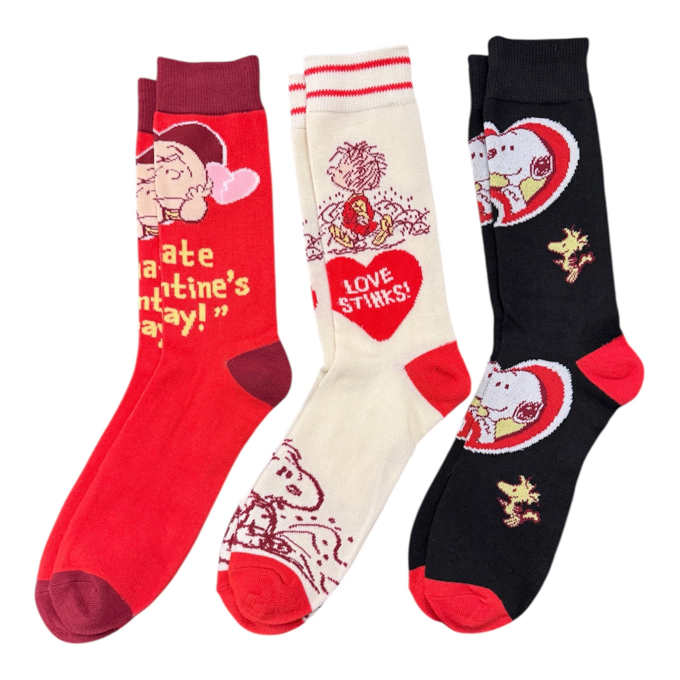 {"id":4893434282055,"title":"PEANUTS Men’s 3 Pair Of VALENTINES DAY Socks PIG-PEN 'LOVE STINKS'","handle":"peanuts-men-s-mustache-snoopy-socks","description":"\u003cp\u003ePEANUTS Men’s VALENTINE'S DAY 3 Pair Of Crew Socks Shoe Size 8-12, Sock Size 10-13\u003c\/p\u003e\n\u003cp\u003eCHARLIE BROWN 'I Hate Valentine's Day'\u003c\/p\u003e\n\u003cp\u003ePIG-PEN 'LOVE STINKS'\u003c\/p\u003e\n\u003cp\u003eSNOOPY \u0026amp; WOODSTOCK\u003c\/p\u003e\n\u003cp\u003e98% Polyester, 2% Spandex \u003c\/p\u003e\n\u003cp\u003eBIOWORLD Brand \u003c\/p\u003e","published_at":"2026-01-18T17:26:51-05:00","created_at":"2020-10-23T22:25:24-04:00","vendor":"Novelty Socks for Less","type":"","tags":[],"price":1499,"price_min":1499,"price_max":1499,"available":true,"price_varies":false,"compare_at_price":null,"compare_at_price_min":0,"compare_at_price_max":0,"compare_at_price_varies":false,"variants":[{"id":32636028223559,"title":"Default Title","option1":"Default Title","option2":null,"option3":null,"sku":"PEANUTSVALENTINES","requires_shipping":true,"taxable":false,"featured_image":null,"available":true,"name":"PEANUTS Men’s 3 Pair Of VALENTINES DAY Socks PIG-PEN 'LOVE STINKS'","public_title":null,"options":["Default Title"],"price":1499,"weight":128,"compare_at_price":null,"inventory_management":"shopify","barcode":"","requires_selling_plan":false,"selling_plan_allocations":[]}],"images":["\/\/noveltysocksforless.com\/cdn\/shop\/files\/55AA7C55-99ED-4D31-AD3C-9A2D56A0623E.jpg?v=1768774713"],"featured_image":"\/\/noveltysocksforless.com\/cdn\/shop\/files\/55AA7C55-99ED-4D31-AD3C-9A2D56A0623E.jpg?v=1768774713","options":["Title"],"media":[{"alt":null,"id":43043835380018,"position":1,"preview_image":{"aspect_ratio":1.0,"height":1512,"width":1512,"src":"\/\/noveltysocksforless.com\/cdn\/shop\/files\/55AA7C55-99ED-4D31-AD3C-9A2D56A0623E.jpg?v=1768774713"},"aspect_ratio":1.0,"height":1512,"media_type":"image","src":"\/\/noveltysocksforless.com\/cdn\/shop\/files\/55AA7C55-99ED-4D31-AD3C-9A2D56A0623E.jpg?v=1768774713","width":1512}],"requires_selling_plan":false,"selling_plan_groups":[],"content":"\u003cp\u003ePEANUTS Men’s VALENTINE'S DAY 3 Pair Of Crew Socks Shoe Size 8-12, Sock Size 10-13\u003c\/p\u003e\n\u003cp\u003eCHARLIE BROWN 'I Hate Valentine's Day'\u003c\/p\u003e\n\u003cp\u003ePIG-PEN 'LOVE STINKS'\u003c\/p\u003e\n\u003cp\u003eSNOOPY \u0026amp; WOODSTOCK\u003c\/p\u003e\n\u003cp\u003e98% Polyester, 2% Spandex \u003c\/p\u003e\n\u003cp\u003eBIOWORLD Brand \u003c\/p\u003e"}