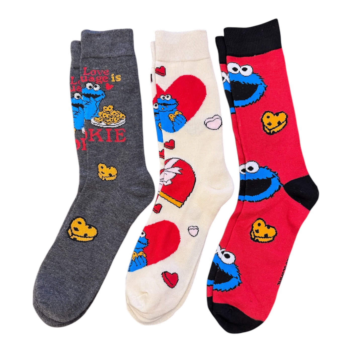 {"id":10088946139442,"title":"SESAME STREET Men’s COOKIE MONSTER Valentines Day 3 Pair Of Socks ‘ME LOVE LANGUAGE IS COOKIE’","handle":"sesame-street-men-s-cookie-monster-valentines-day-3-pair-of-socks-me-love-language-is-cookie","description":"\u003cp\u003eSESAME STREET Men's 3 Pair Of VALENTINE'S DAY Crew Socks Shoe Size 8-12, Sock Size 10-13\u003c\/p\u003e\n\u003cp\u003eCOOKIE MONSTER 'ME LOVE LANGUAGE IS COOKIE'\u003c\/p\u003e\n\u003cp\u003e97% Polyester, 3% Spandex\u003c\/p\u003e\n\u003cp\u003eBIOWORLD Brand\u003c\/p\u003e","published_at":"2026-01-18T16:26:39-05:00","created_at":"2026-01-18T16:22:29-05:00","vendor":"Novelty Socks And Slippers","type":"SOCKS","tags":[],"price":1499,"price_min":1499,"price_max":1499,"available":true,"price_varies":false,"compare_at_price":null,"compare_at_price_min":0,"compare_at_price_max":0,"compare_at_price_varies":false,"variants":[{"id":50832198959410,"title":"Default Title","option1":"Default Title","option2":null,"option3":null,"sku":"COOKIEVALENTINES","requires_shipping":true,"taxable":false,"featured_image":null,"available":true,"name":"SESAME STREET Men’s COOKIE MONSTER Valentines Day 3 Pair Of Socks ‘ME LOVE LANGUAGE IS COOKIE’","public_title":null,"options":["Default Title"],"price":1499,"weight":57,"compare_at_price":null,"inventory_management":"shopify","barcode":null,"requires_selling_plan":false,"selling_plan_allocations":[]}],"images":["\/\/noveltysocksforless.com\/cdn\/shop\/files\/C5A4D60A-F685-49F2-AC0F-5C449F46BEA3.jpg?v=1768771367"],"featured_image":"\/\/noveltysocksforless.com\/cdn\/shop\/files\/C5A4D60A-F685-49F2-AC0F-5C449F46BEA3.jpg?v=1768771367","options":["Title"],"media":[{"alt":null,"id":43043715350834,"position":1,"preview_image":{"aspect_ratio":1.0,"height":1512,"width":1512,"src":"\/\/noveltysocksforless.com\/cdn\/shop\/files\/C5A4D60A-F685-49F2-AC0F-5C449F46BEA3.jpg?v=1768771367"},"aspect_ratio":1.0,"height":1512,"media_type":"image","src":"\/\/noveltysocksforless.com\/cdn\/shop\/files\/C5A4D60A-F685-49F2-AC0F-5C449F46BEA3.jpg?v=1768771367","width":1512}],"requires_selling_plan":false,"selling_plan_groups":[],"content":"\u003cp\u003eSESAME STREET Men's 3 Pair Of VALENTINE'S DAY Crew Socks Shoe Size 8-12, Sock Size 10-13\u003c\/p\u003e\n\u003cp\u003eCOOKIE MONSTER 'ME LOVE LANGUAGE IS COOKIE'\u003c\/p\u003e\n\u003cp\u003e97% Polyester, 3% Spandex\u003c\/p\u003e\n\u003cp\u003eBIOWORLD Brand\u003c\/p\u003e"}