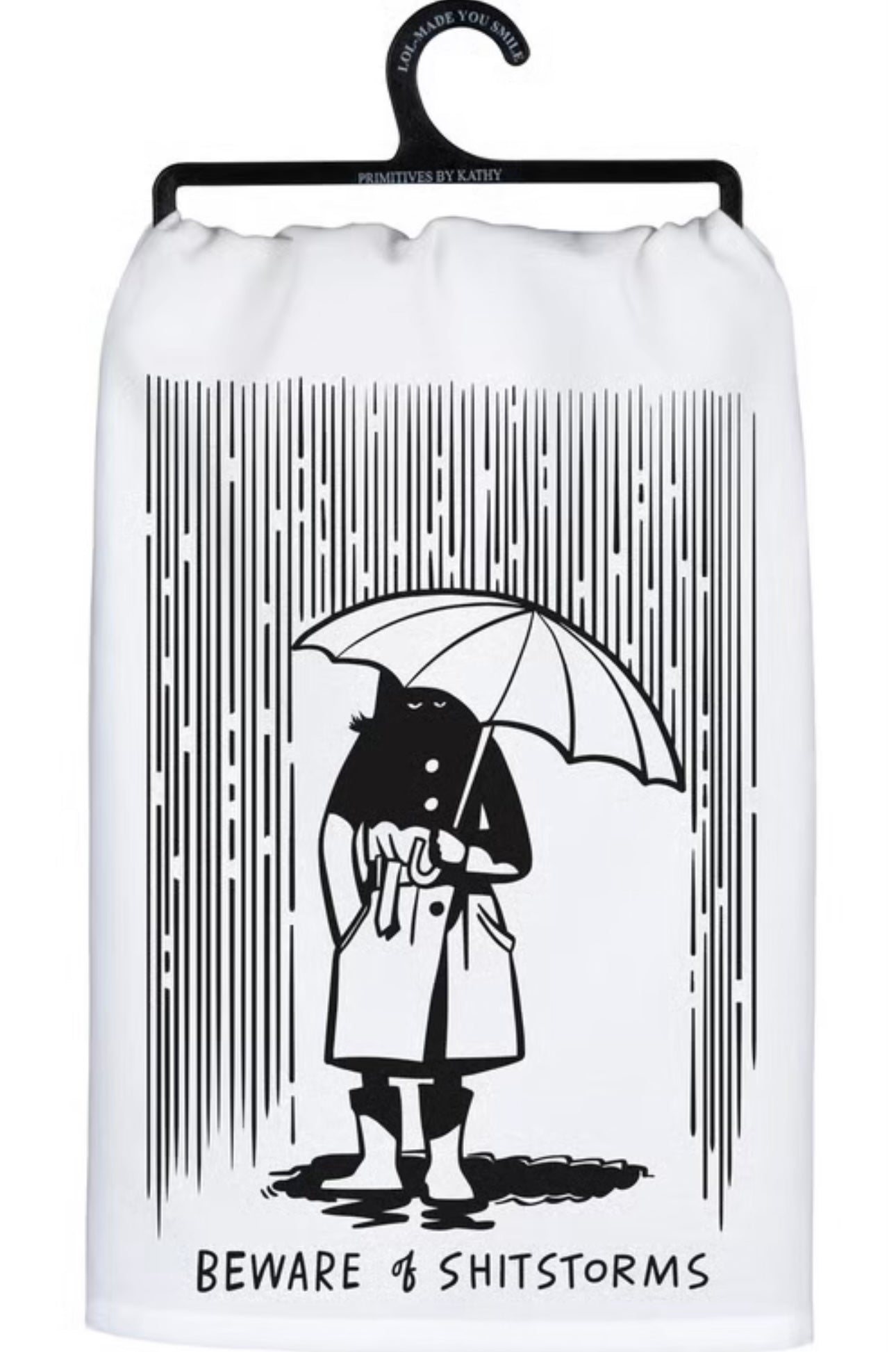 Black and white cotton kitchen towel displaying a hand illustrated design of a person in pouring rain with humorous "Beware Of Shitstorms" sentiment.