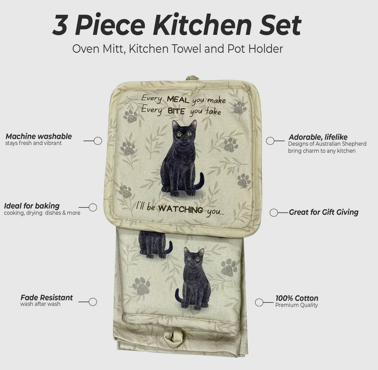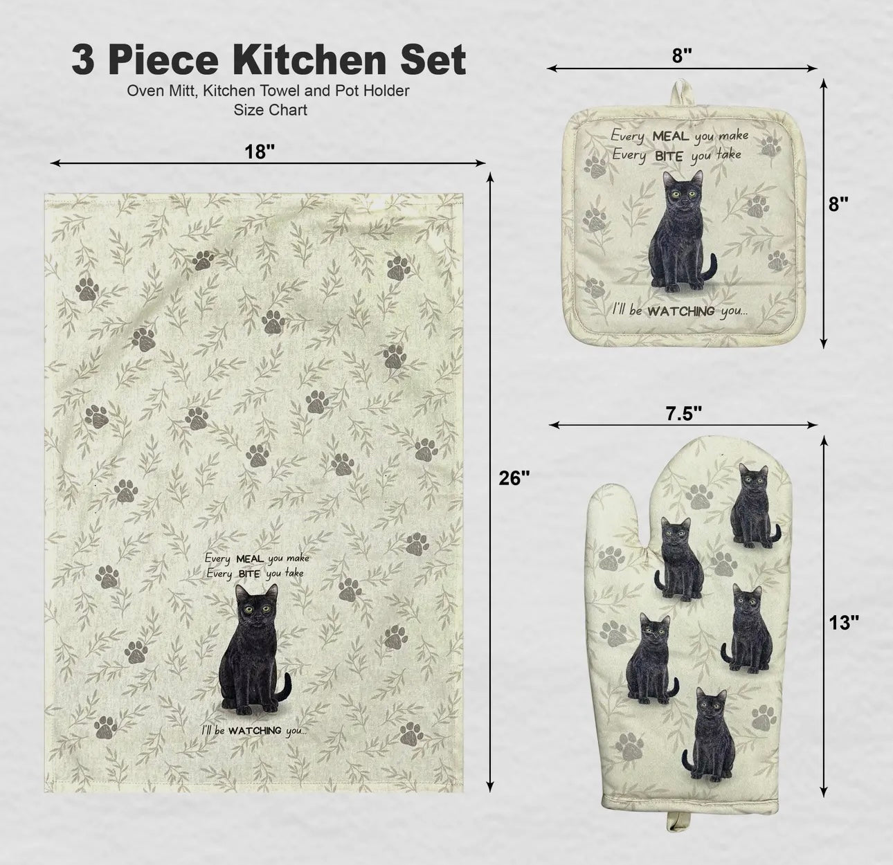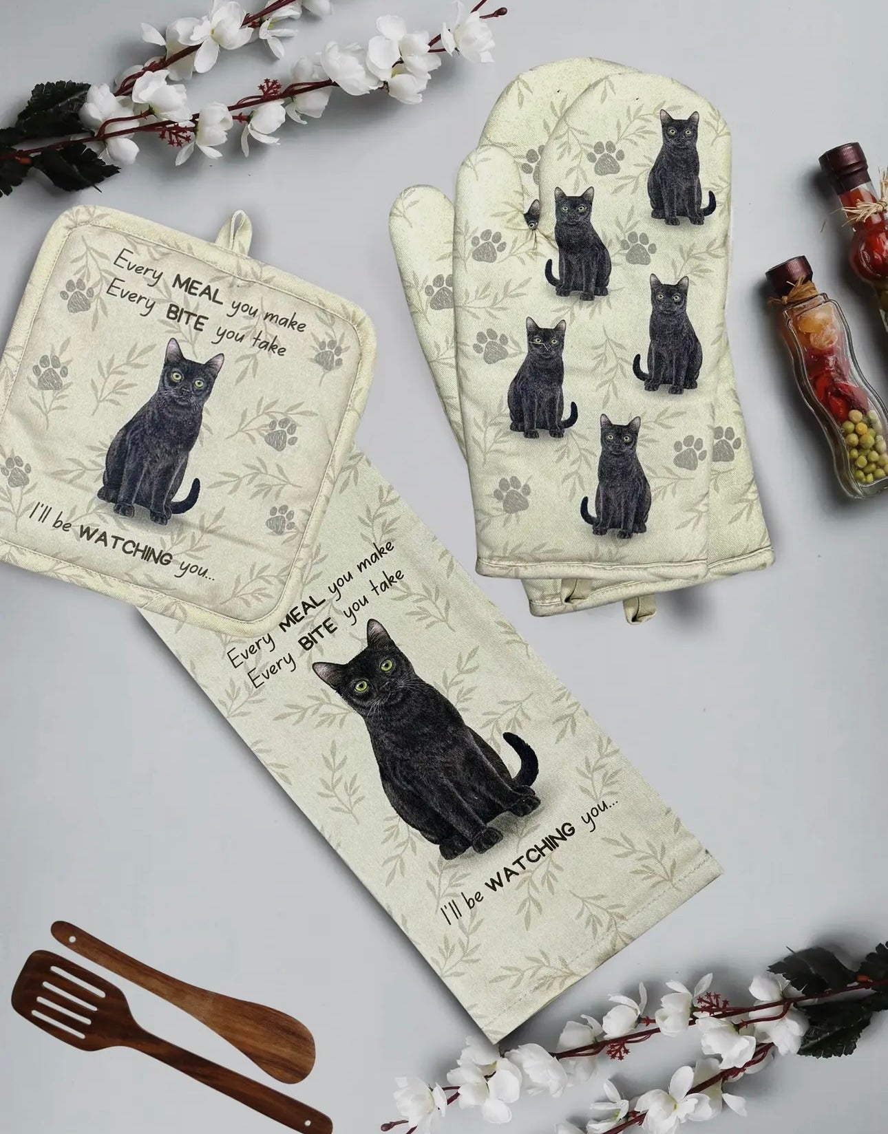 BLACK CAT 3-Piece Kitchen Set - Oven Mitt, Pot Holder & Kitchen Towel Set, Heat Resistant up to 420 F, Soft Quilted Cotton for Cooking, Baking, BBQ, Pet Lover Gifts