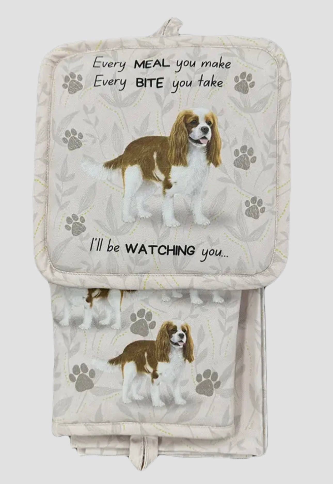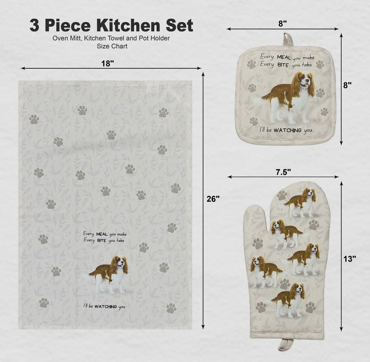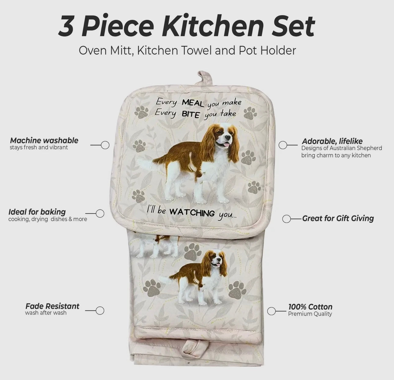 CAVALIER KING CHARLES Dog 3-Piece Kitchen Set - Oven Mitt, Pot Holder & Kitchen Towel Set, Heat Resistant up to 420 F, Soft Quilted Cotton for Cooking, Baking, BBQ, Pet Lover Gifts